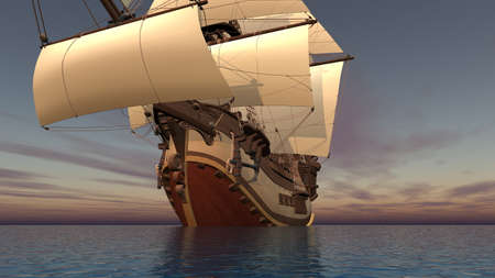 Red Wooden Vintage Tall Sailing Ship, Caravel, Pirate Ship or Warship in Open Ocean extreme closeup. 3d Rendering