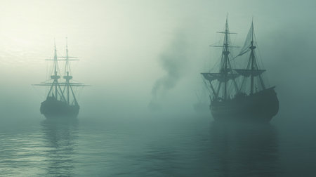Silhouette of two old sailing ships in the misty sea