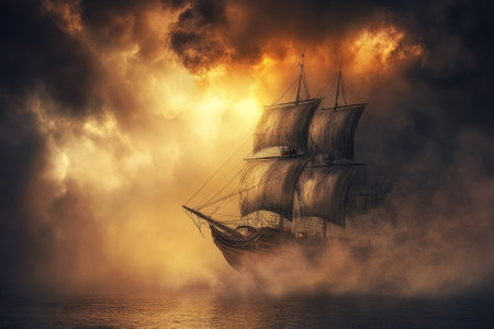 An impressive sailing vessel battles through dark clouds and mist during a striking sunset over water.