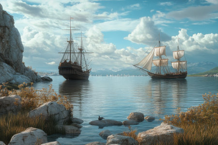 Two sailing ships glide on calm waters, framed by rocky shores and distant mountains under a vivid sky.