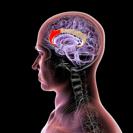 Anterior cingulate cortex, 3D illustration. Shown in red on a brain mid-section. This region regulates emotion, decision-making, and is implicated in depression and chronic pain.
