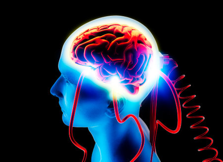 Concept of brain wave recording in Parkinson disease surgery. Microelectrode recording in midbrain. Brain model on white background.