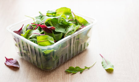 Salad mix in a box. Fresh mixed salad leaves in plastic container