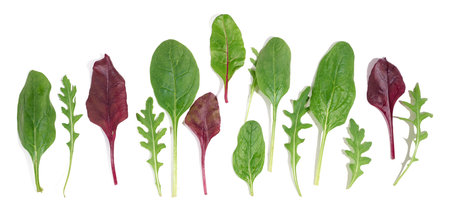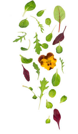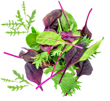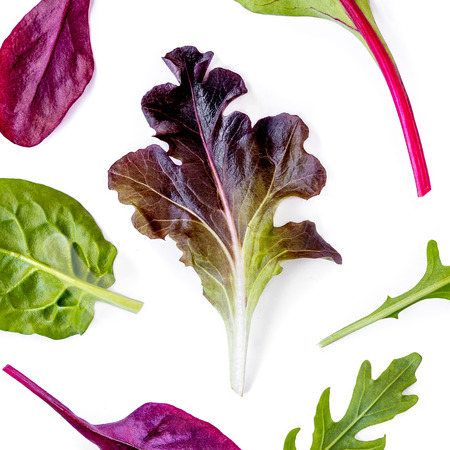 Fresh Spring mix leaves isolated. Green salad leaves on white. Pile of arugula, lettuce, spinach and beets leaves close up. Top view