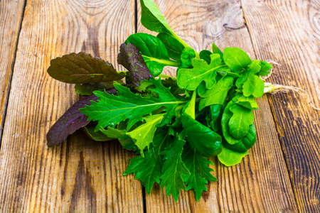 Mix of different lettuce leaves on a wooden background. Vegetarian food.