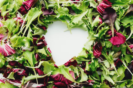 Heart shape from green and purple salad leafs mix background. White table