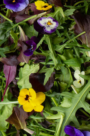 Delicate floral salad, colorful floral salad garnished with edible flowers. Copy space.