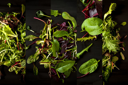 Collage from different pictures of tasty mix salad leaves over dark wood plate, black background. Top view