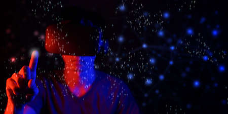 A young girl using a virtual reality helmet plays. Neon red and blue lights on a space background. Holding hand outstretched forward, stop sign.