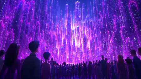 Silhouetted people gaze at a dazzling, neon-lit cityscape featuring numerous tall buildings radiating intense magenta and violet light.