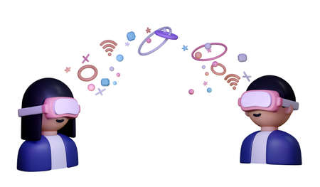 3D Rendering of girl boy with visual reality glasses sharing information platform concept of VR Metaverse technology. 3D Render illustration cartoon style.