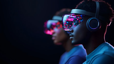 People wearing VR goggle while enter metaverse with neon color background. People with VR headset against abstract neon pattern background. Concept of virtual reality and futuristic technology. AIG35.
