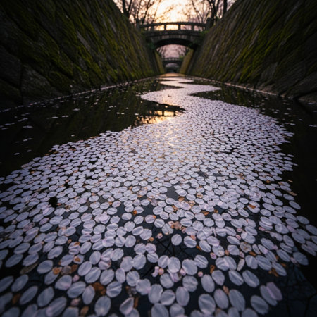 Japanese garden with lotus petals at sunset, Kyoto, Japan