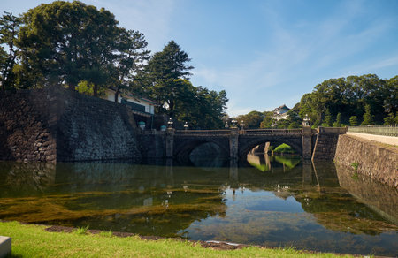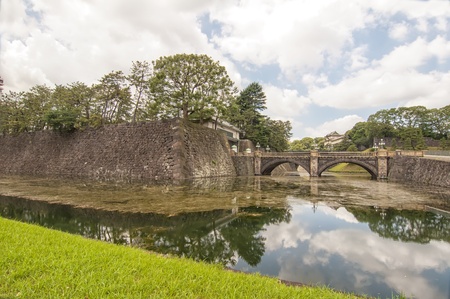 Seimon Ishibashi Bridge leads to the main gate of Imperial Palace. It is known as the Eyeglasses Bridge (Meganebashi) because of its stone-arch reflecting in the water of Nijubashi-moat. Tokyo. Japan