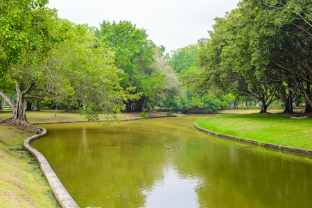 Beautiful scenery of Chatuchak Park Bangkok, Thailand lake water full of lilas lotus bench on the bank