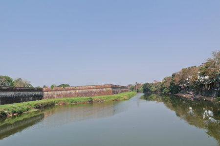 A well-preserved stone wall covered in foliage stands next to a calm waterway, with greenery reflecting the tranquil atmosphere of the afternoon.