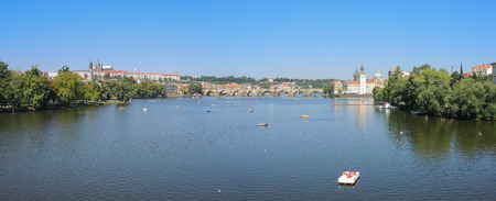 Panoramic view of Vltava river, Prague castle, Charles bridge and colorful rooftops of New Town on a bright summer day, in Prague, Czech Republic