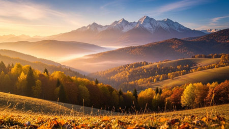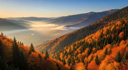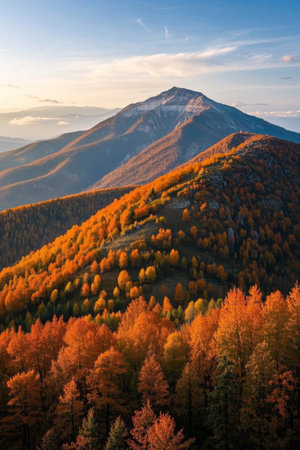 Majestic autumn mountainside scenery with colorful foliage at sunset