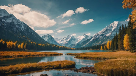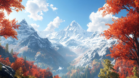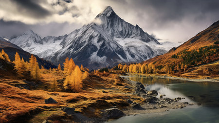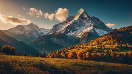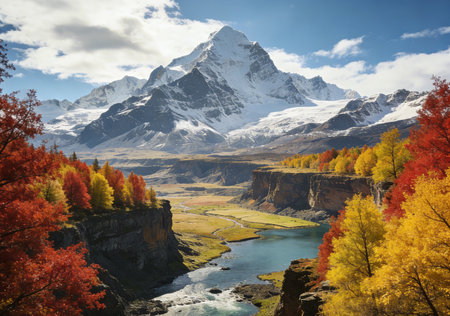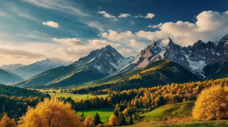 Majestic autumn mountains landscape with vibrant foliage and snow