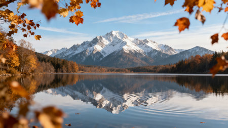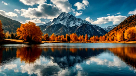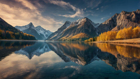 Stunning autumn lake reflecting colorful trees and mountains at sunset. Peaceful and serene.