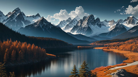 Beautiful autumn landscape with mountain lake and snowcapped peaks.