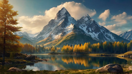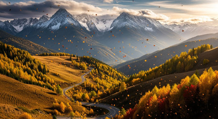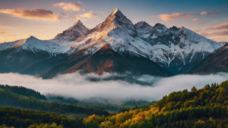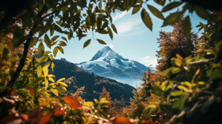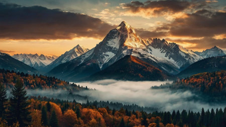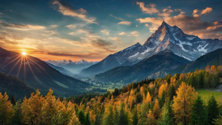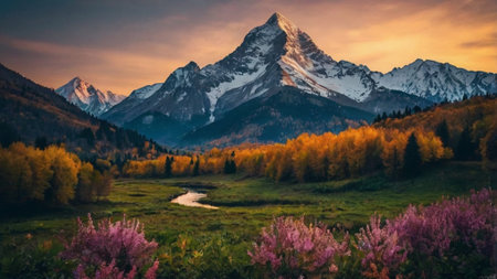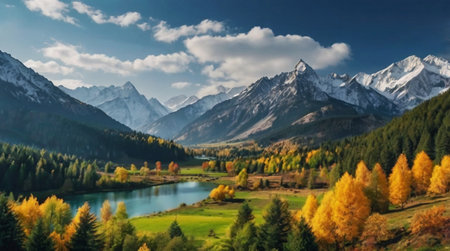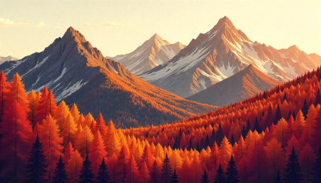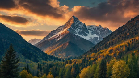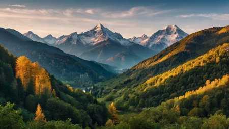 Autumnal mountain landscape featuring vibrant forests and snow capped peaks