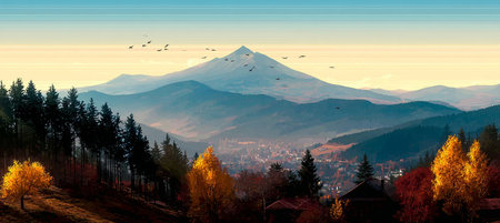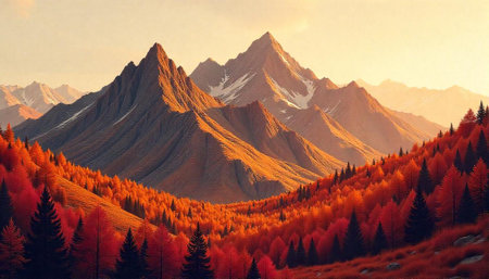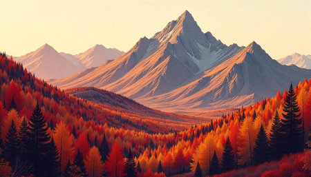 Autumn mountain landscape with vibrant forest under warm light