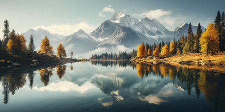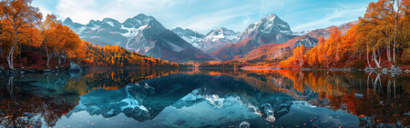 Panoramic view of colorful autumn alpine landscape with lake and mountains.