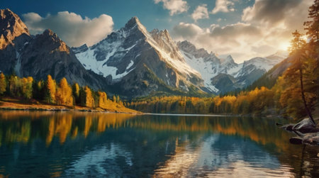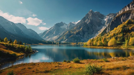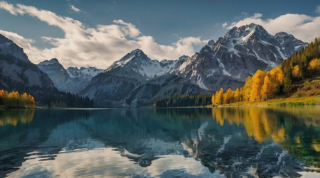 panoramic view of autumn alpine landscape with mountain lake and snowcapped peaks