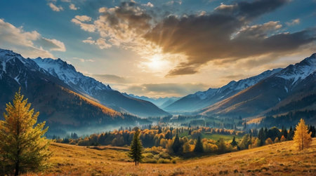 Sunrise illuminates a breathtaking mountain valley. Serene landscape.