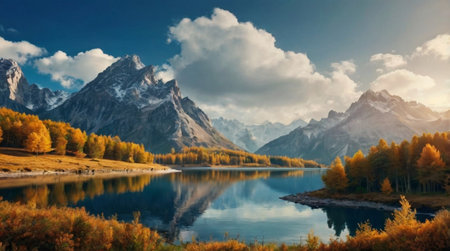 Colorful autumn landscape with alpine lake and mountains in the background