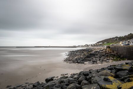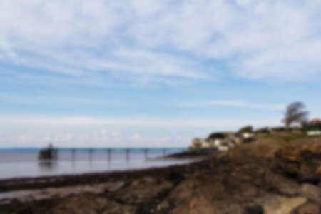 View over rocks at Clevedon sea front, including pier in background. Out of focus.