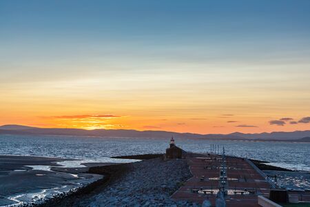 Orange sunset at Morecambe Bay with Lighthouse at the end of the Stone Jetty.