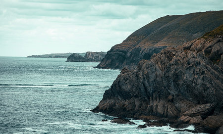 Rocky coastline with steep cliffs and waves crashing against the shore under cloudy sky.