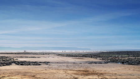 View to the sea from Northam Burrows, north Devon, UK. Tide out. Some people in the distance in the waves. Dramatic wide river estuary.