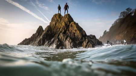 A dramatic low angle shot from the waters surface shows two triumphant hikers on a rugged sea stack surrounded by waves under a vast sky.
