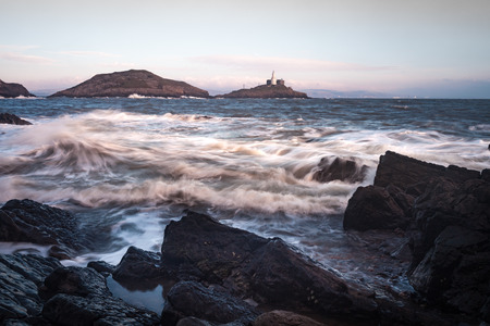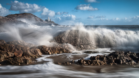 Crashing waves and Mumbles lighthouse on the Gower peninsula, South Wales.