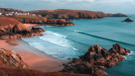 Stunning Coastal Landscape at Sunset, Featuring Dramatic Skies, Rugged Rocks, and Serene Beaches