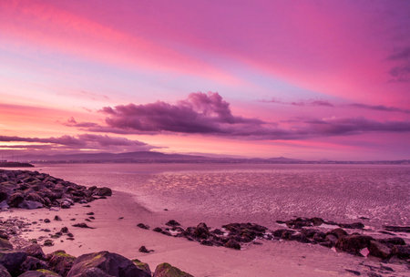 Sunset over a Scottish coastline in winter at a sandy beach at Kirkcudbright Bay