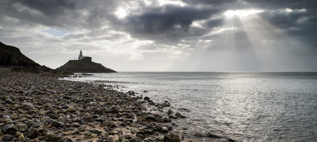 Landscape panorama of Mumbles lighthouse in Wales with sun beams over sea