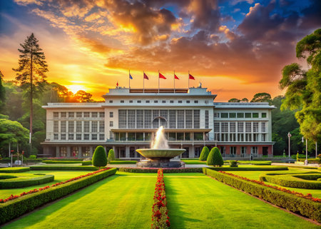 Majestic Independence Palace in Ho Chi Minh City, Vietnam, boasts a stunning facade with intricate architecture, ornate details, and lush green surroundings at sunrise.