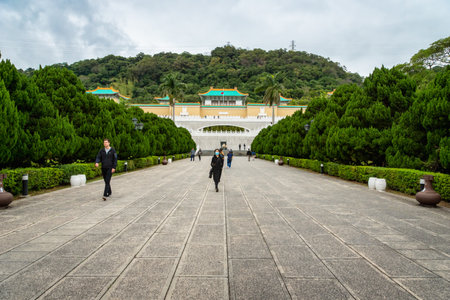 Taipei, Taiwan - March 2019: National Palace Museum architecture and visitors around. The museum is a popular landmark for locals and tourists in Taipei, Taiwan.