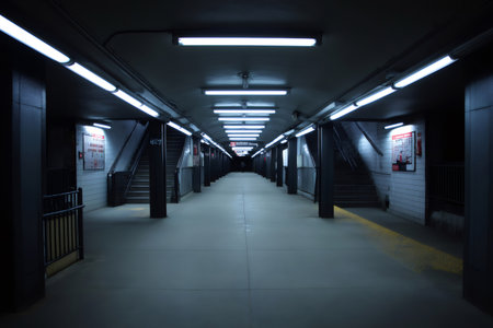 Deserted subway station platform illuminated by cold fluorescent lights with staircases on each side