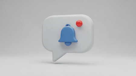 A 3D rendered notification bell icon within a white speech bubble, featuring a small red dot indicating an alert.