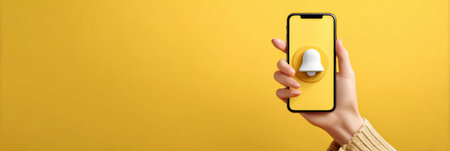A hand is holding a smartphone displaying a notification bell icon. The bright yellow background enhances the attention to mobile alerts.