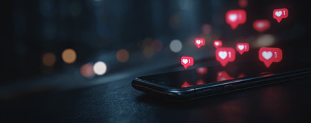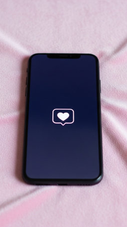 Smartphone notification heart like social media digital technology communication night. Smartphone dark surface with glowing heart notification
