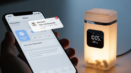 A modern health device with a connected app for medication reminders and health tracking.