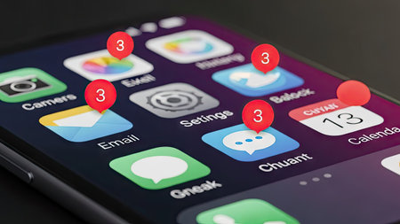 The image showcases a smartphone display featuring app icons, including email, messaging, and calendar applications. Each icon displays red notification badges. The scene presents a selective focus, with a dark background. The scene suggests general usage, suitable for visual communication or marketing.
