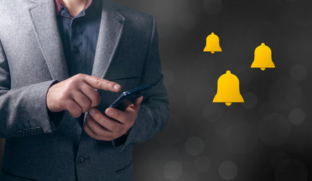 Businessman hand using smartphone with notification notification bell on the screen.
