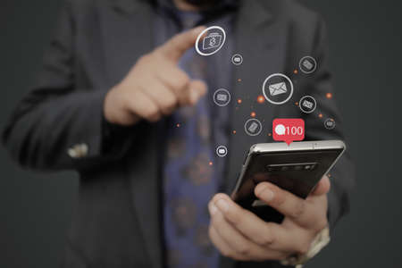 Contact us sms media man use smart phone social media network pop notification icons
